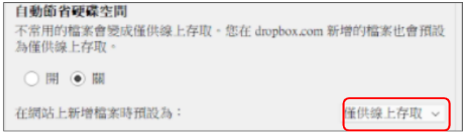 僅供線上存取的檔案仍會占用一點點硬碟空間,這是因為占位符需要空間存放檔案名稱和連至 dropbox.com 的捷徑,但和檔案本身大小相比,占據的空間少很多。