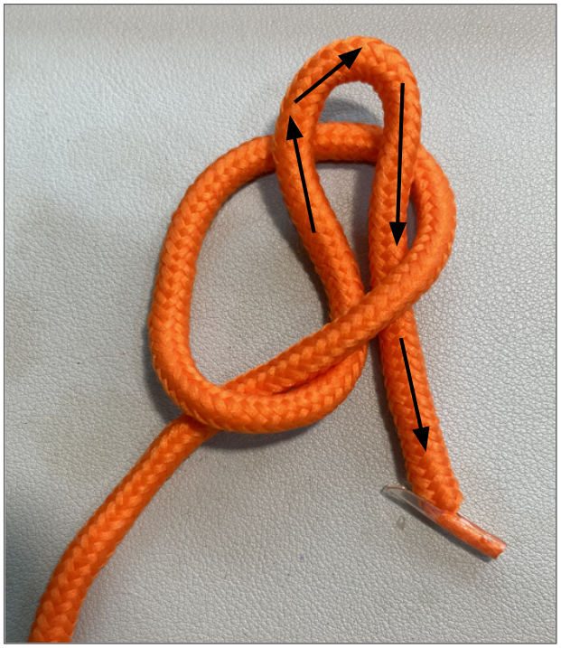 步驟一: 右線壓左線步驟二: 右線做圈由後面進繩圈步驟三: 將右線的繩圈往上拉出步驟四:收緊!利用右邊線頭可以調整繩圈大小步驟五: 左線繞過柱子後面,再做繩圈步驟六: 左線做的繩圈穿入之前右線作的繩圈步驟七: 完成!右端的線往下拉,可以拉緊左端的線往下拉,可以將繩子解除,用於垂降後收線。
