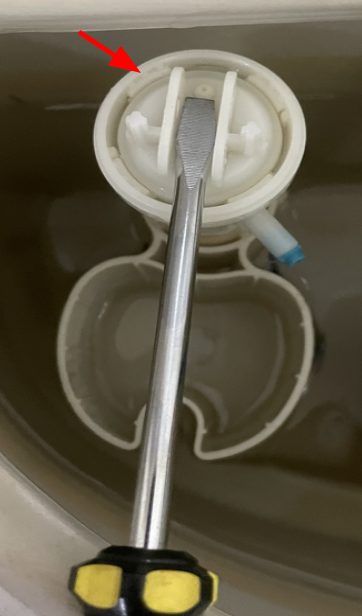 HTC抽水馬桶滿水有異音,發現注水處有些微水流出(紅色箭頭處),懷疑注水處漏水第一步先將進水處關閉,下圖中關水用鉗子逆時針方向旋開(不要用一字起旋開,因為通常很緊,無法旋開)這個裝置叫三角凡爾,原理如下圖它的原理是順時針旋入時塑膠頂針頂入後才會注水第二步將上蓋撬開(注意!!用一字起子,利用槓桿原理往下壓,不要往上扳,否則無法打開且藍色蓋子會損壞)藍色上蓋的型號是HCG CF1355A-BK蝦皮一組要 $790,另外請師傅的工錢應該大於這個價錢!!第三步從左側移除插銷(用兩隻手,右手壓推,左手拉),之後就可以移除槓桿及浮水裝置插銷移除後第四步用一字起逆時針將其轉至紅色箭頭處,就可以取出止水墊片分離黑色墊片後,用刷子清潔後,反步驟裝回